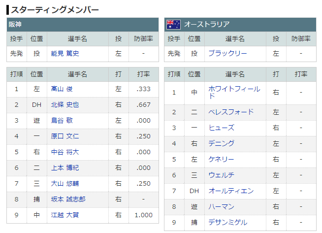 引用元: ・阪神×オーストラリアのスタメン発表される、3番遊撃鳥谷、7番大山、9番に江越