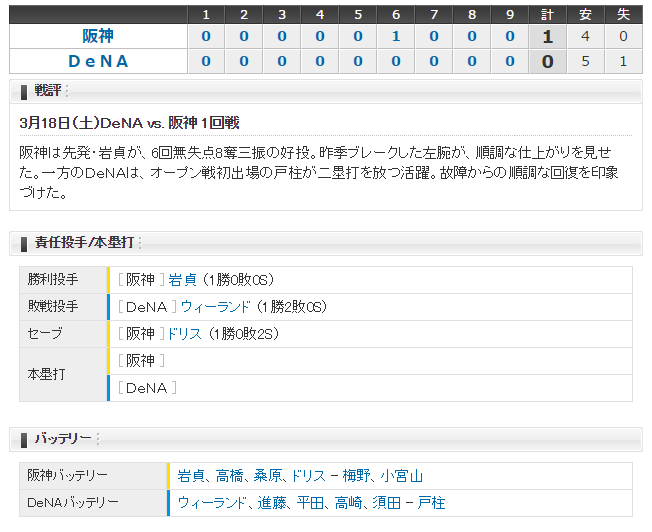 【オープン戦動画】試合結果 DeNA 0-1 阪神 2017/3/18
