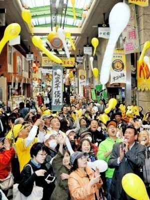 アーケードからつり下げた鳥居の下で、近くの尼崎えびす神社の太田垣亘世(のぶよ)宮司が優勝を祈念。名誉応援団長のプロレスラー空牙(クーガー)さんがマジック「143」と書かれたボードを掲げ、六甲おろしの合唱とジェット風船を飛ばして盛り上げた。