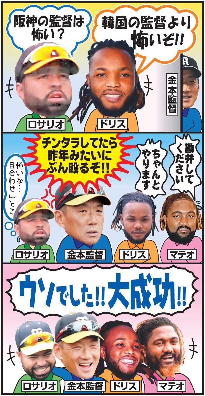 2日がかりの大仕掛け。ハンファ在籍時に猛将で知られる「野神」金星根(キムソングン)監督の下でプレーしたロサリオが「阪神の監督はどうなんだ」と気に掛けている―という情報をゲット。それが、「いたずら心」をくすぐった。 仕掛け人は即座に動いた。ドリスを仲間に引き入れ、ロサリオに「(金本監督は)あれ(金星根)以上だ」と吹き込ませた。
