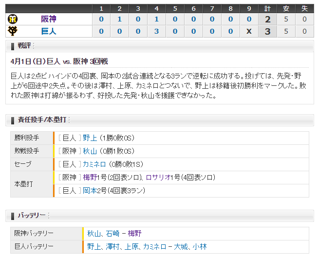 巨人 0 0 0 3 0 0 0 0 x 3