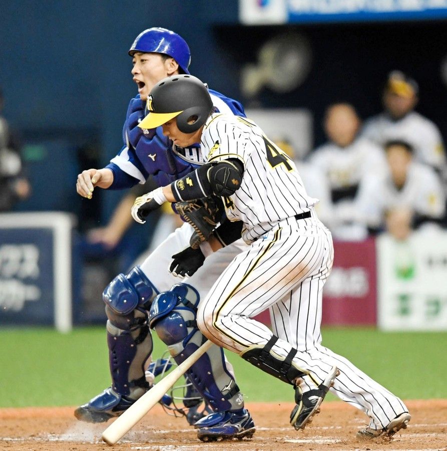 続く梅野は中日守備陣が警戒する中で初球からセーフティースクイズを試みた。初球ファウルで2球見逃してカウント2-1からの4球目、
