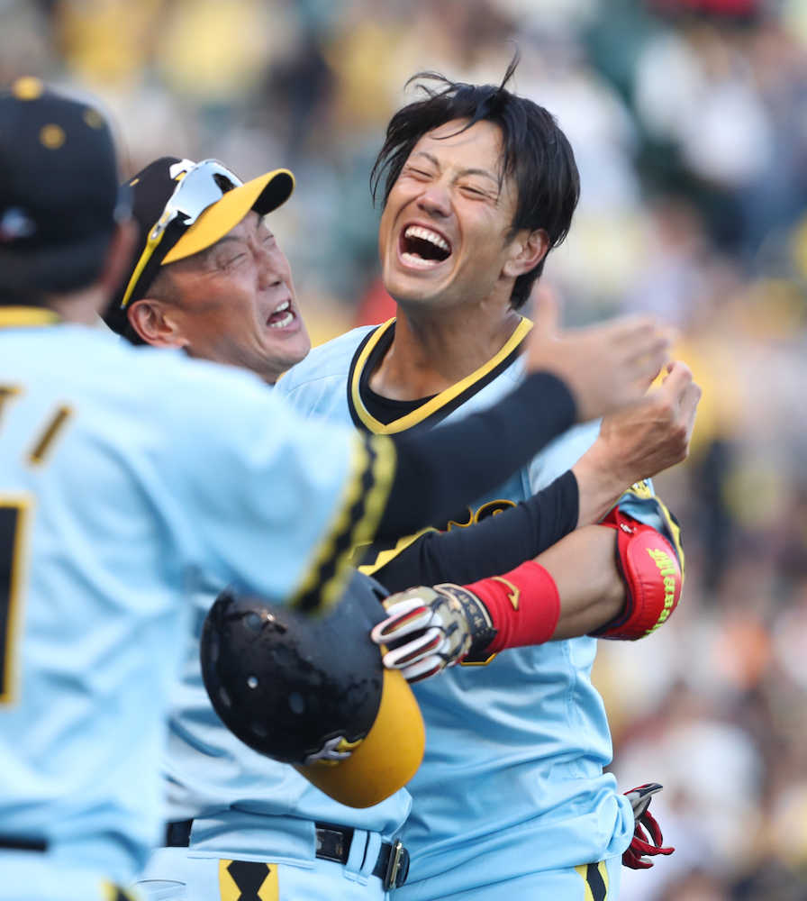 沢村の直球を引っ張った打球は三遊間を抜き、サヨナラ打に。「打った感触はそこまでよくなかったですけど、抜けてくれて、糸原がよく