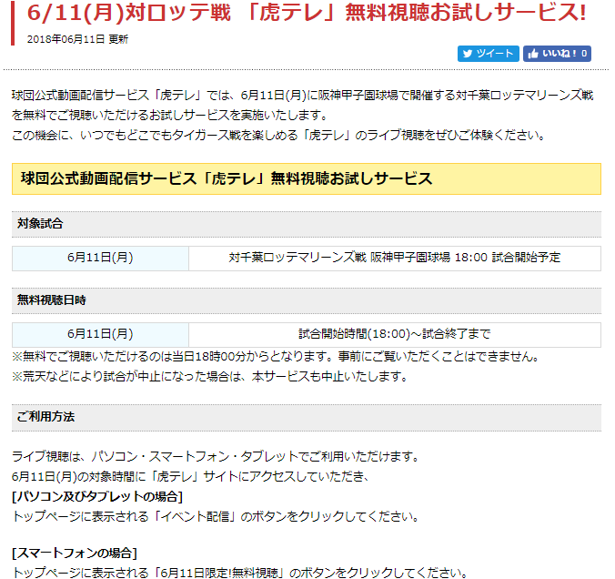 6/11(月)対ロッテ戦 「虎テレ」無料視聴お試しサービス!
