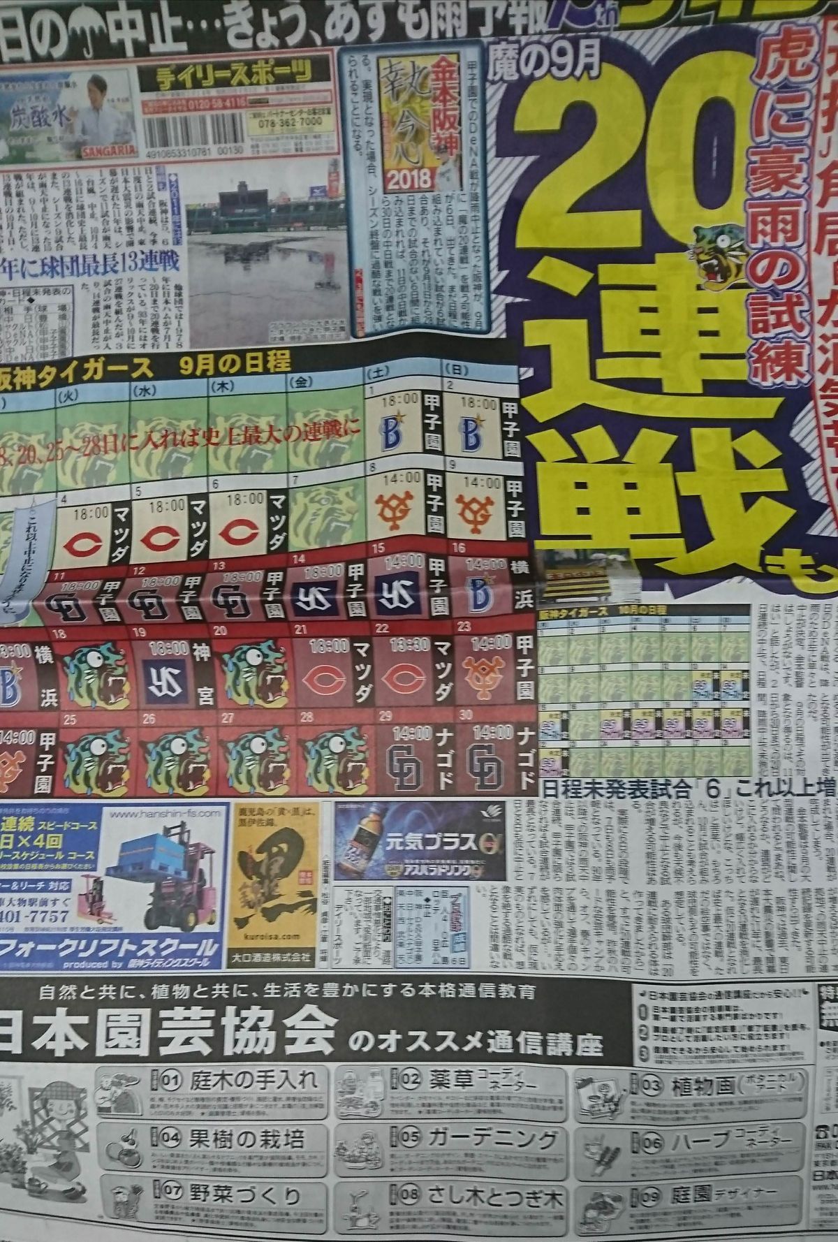 甲子園でのDeNA戦が降雨中止となった阪神が、9月に「魔の20連戦」を戦う可能性が6日、出てきた。まだ日程に組み込まれていない試合が6試合あり、それが9月18日から28日までの試合のない6日間に組み込まれれば、11日の中日戦から30日の中日戦まで20連戦となる。実現となった場合、シーズン終盤に過酷な戦いを強いられることになる。 【写真】DeNA疲れた…横浜~甲子園移動に4時間以上 記録的大雨の影響は、今後の日程にも大きく及んでくる。この日のDeNA戦は、降雨のため正午に早々と中止が決定。