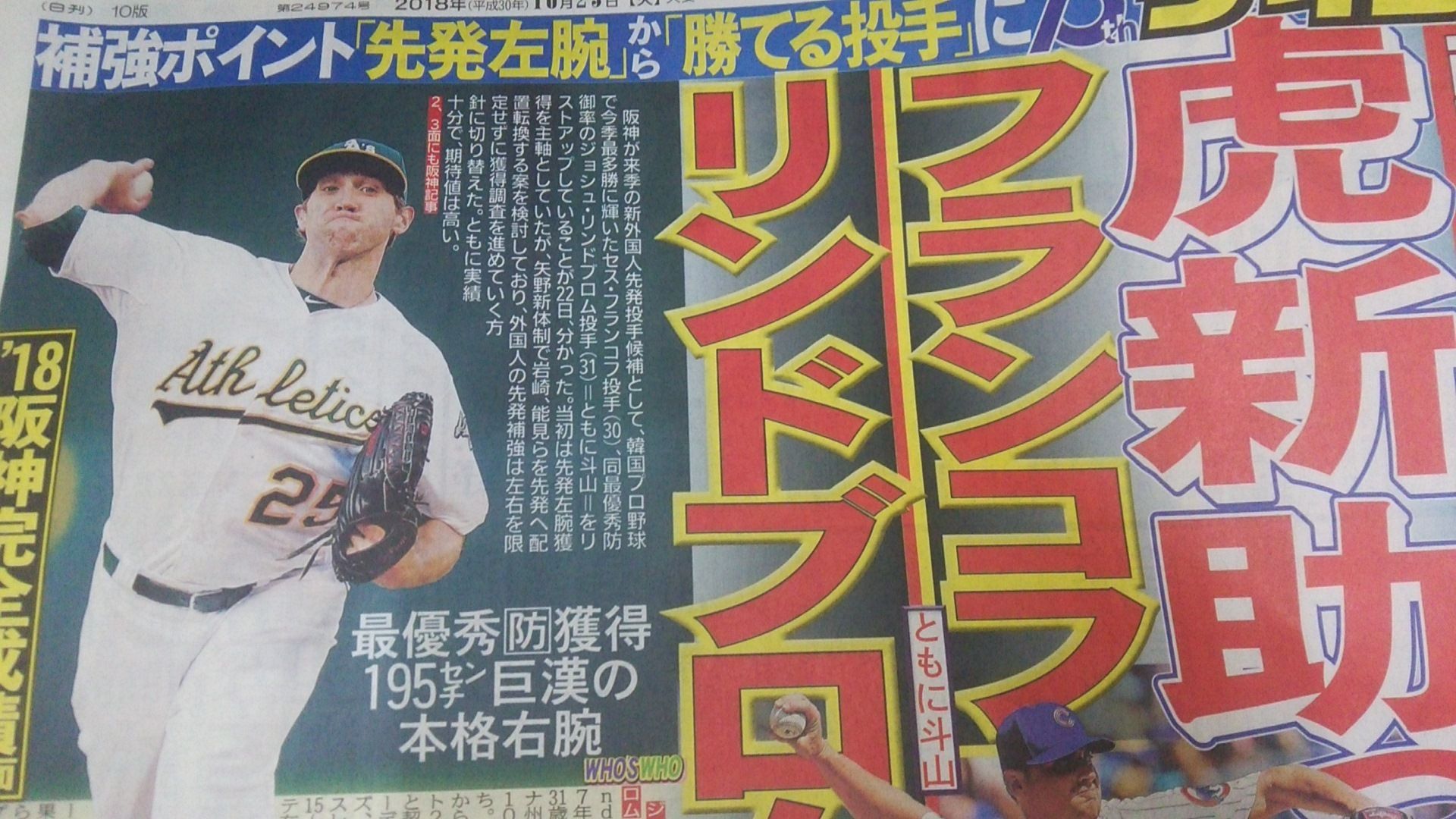 阪神が来季の新外国人先発投手候補として、韓国プロ野球で今季最多勝に輝いたセス・フランコフ投手(30)、 同最優秀防御率のジョシュ・リンドブロム投手(31)=ともに斗山=をリストアップしていることが22日、分かった。