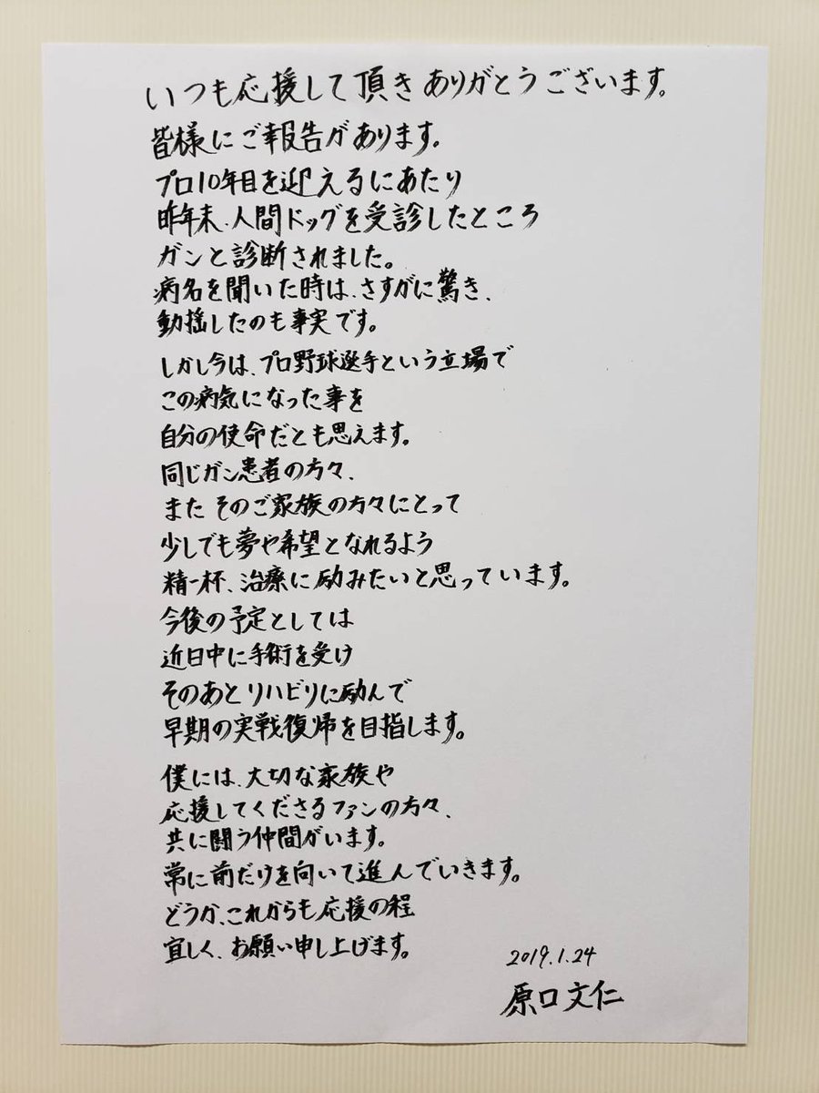 2月1日からの春季キャンプで1軍の沖縄・宜野座組から外れていた阪神・原口文仁捕手(26)が24日、自身のツイッターアカウントを開設し、大腸がんであることを公表した。直筆メッセージを掲載し、進行度などは明かさなかったが、治療に専念するためキャンプには参加せず、近日中に入院、手術を行うことを明かした。 「皆様にご報告があります。」と始まる自筆のメッセージを掲載し、こう続けた。 「プロ10年目を迎えるにあたり、昨年末、人間ドックを受診したところガンと診断されました。病名を聞いた時は、さすがに驚き、動揺したのも事実です。しかし今は、プロ野球選手という立場でこのような病気になった事を自分の使命だと思えます。同じガン患者の方々、また、そのご家族の方々にとって少しでも夢や希望となれるよう精一杯、治療に励みたいと思っています。今後の予定としては、近日中に手術を受け、そのあとリハビリに励んで早期の実戦復帰を目指します」