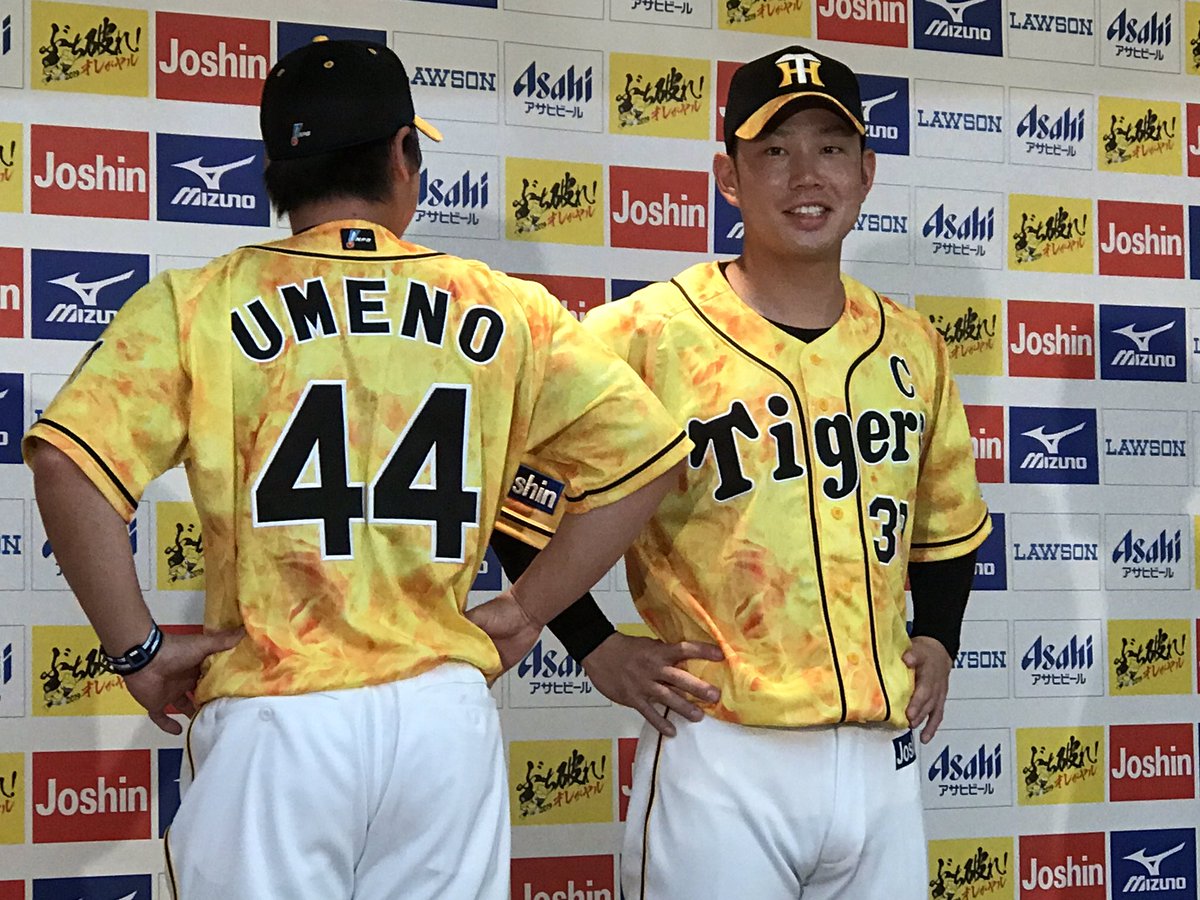 ウル虎の夏2019で着用されるユニフォームが発表されました!梅野選手と今年から胸に「C」の文字が入った糸原選手が登場!燃えるようなデザインのユニフォームは梅野・糸原両選手が企画に関わったようです!「今年からCの文字を着けるようになった思いは?」の問いに糸原選手は「重いです(笑)」 pic.twitter.com/fosrcMjwdS