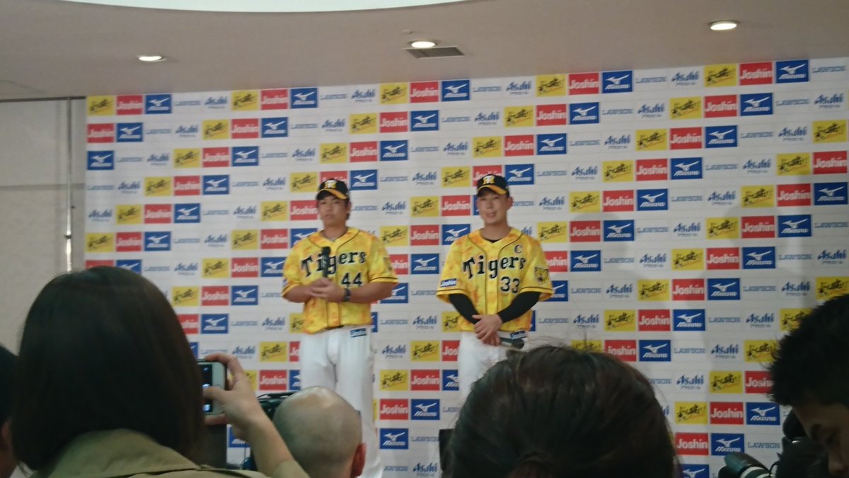 阪神、毎年恒例「ウル虎の夏」で着るサードユニホーム発表会!梅野、糸原両選手がポージングを決めています(^^)