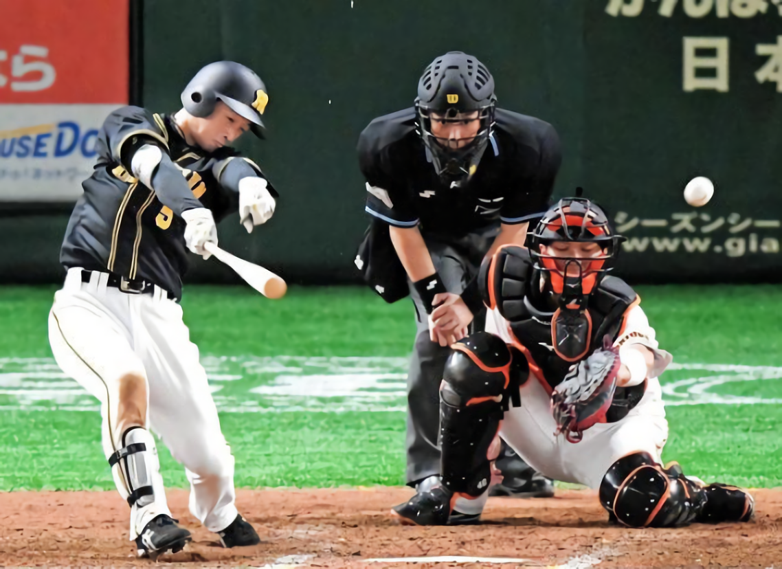 6点を追う八回。打線はここまで巨人・先発メルセデスを前に3安打無得点と抑え込まれていた。だが2本の安打で2死一、二塁とすると、北條の内野安打で満塁。みんながつないだ好機で、近本はフルカウントから2球ファウルで粘る。そして8球目。外角一杯の直球を捉えて2点適時打とした。