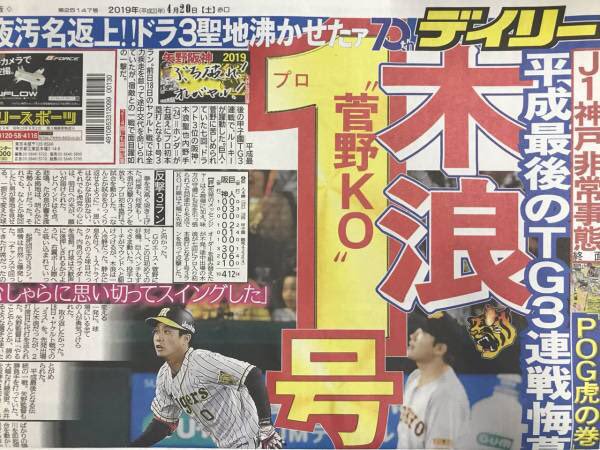 平成最後の「伝統の一戦」で、令和のヒーローの予感漂うルーキーが躍動した。完敗を喫した中、阪神ドラフト3位・木浪聖也内野手(24)=ホンダ=が七回、巨人・菅野から右越えにプロ初本塁打となる1号3ラン。前日のヤクルト戦では全力疾走を怠って途中交代を命じられただけに、汚名返上の一発となった。
