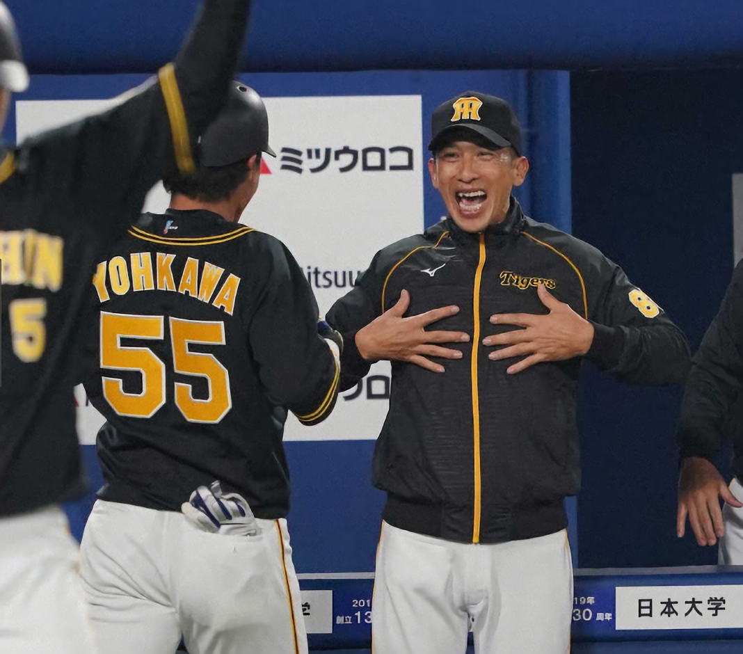 24日のDeNA戦で9回にダメ押しの今季1号を放った陽川を三塁ベンチ前で祝福。その際、チームメートが考案した陽川の「歓喜のゴリラポーズ」を指揮官が真っ先に実践して活躍をたたえた。“今季初”の光景に「陽川の得意なポーズなのでね」と得意げな表情をみせた。