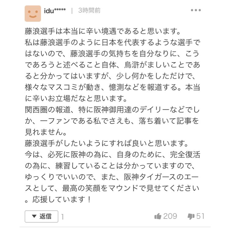 阪神ファンである以上、復活するところが見たいに決まっとる、だから藤浪選手のことを信じて皆でもっと応援しましょうよ、がんばれ藤浪。