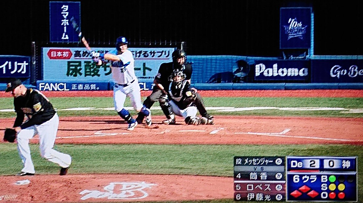 メッセンジャーは二回に1イニング4四球を与えながらも無失点に抑える珍しい投球を見せて乗り切ったが、五回には早くも自己ワーストとなる7個目の四球を与えてしまう。直後に1死満塁からロペスに先制犠飛を打たれた。必然的に球数も増え、球威も落ちる。六回にも死球、四球を与えて1死満塁とすると、宮崎に直球を狙われて中前適時打。なおも2死満塁から筒香に左翼フェンス直撃の2点二塁打を打たれて、谷川に交代となった。谷川もロペスに左前2点適時打を打たれ、この回6点を奪われた。