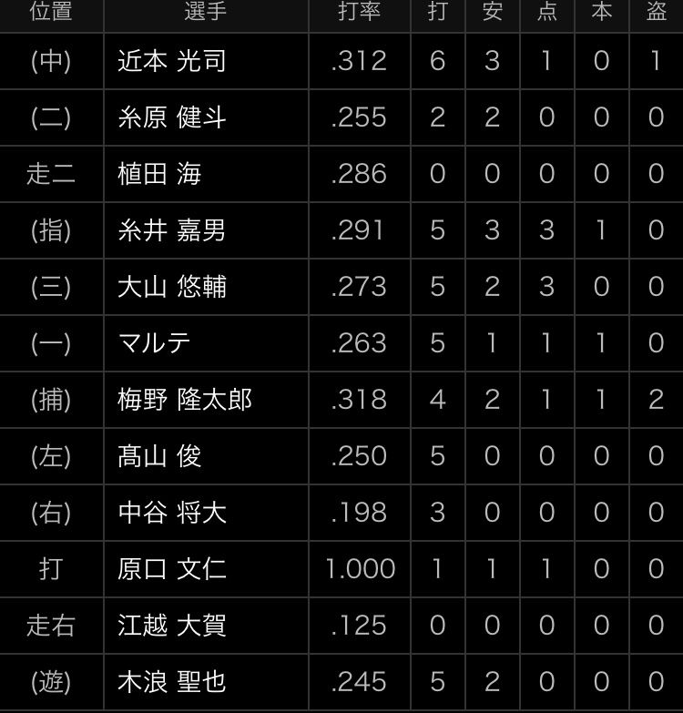 中谷は昨日ロサリオかな?って感じのクルクルだったからまぁ うん でも外野どうするんや 高山もいつもの高山に戻ってたし