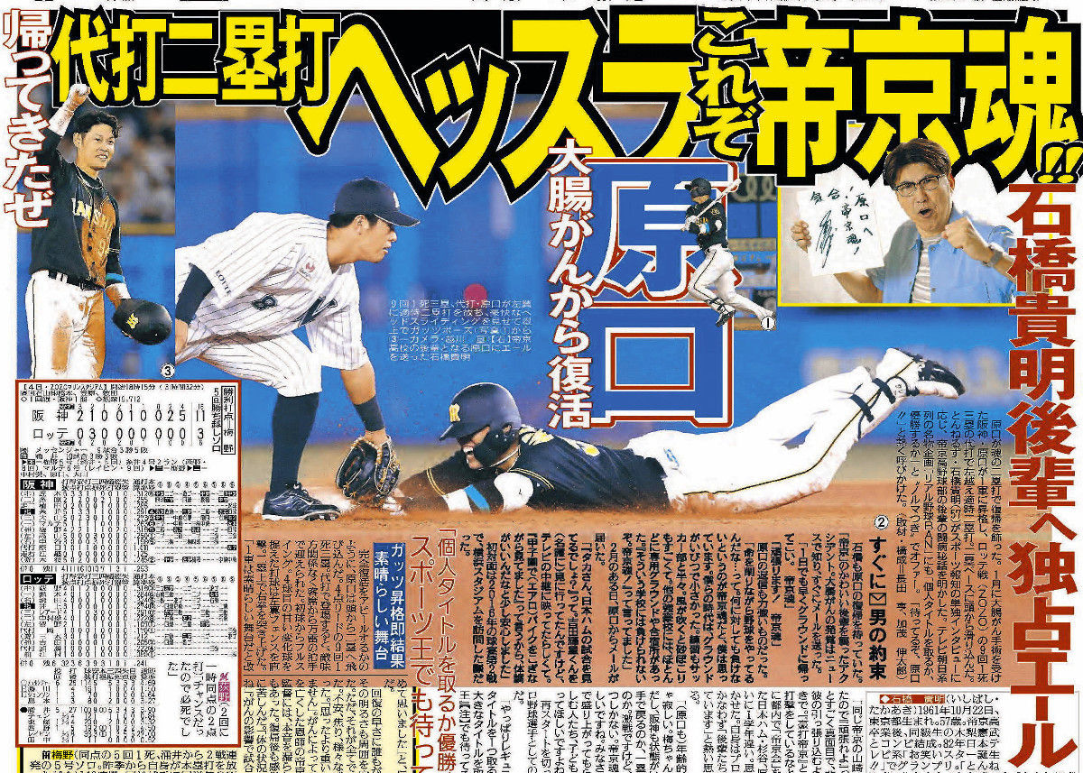 4日に復帰した原口の携帯電話には、とんねるず・石橋貴明さんから「頑張れよ」の祝福メールが届いていた。石橋さんは、スポーツ報知の単独インタビューで「スポーツ王でも待ってるぞ!」と、タイトルを取るか、優勝するかの条件付きで、テレビ朝日系列の名物企画「リアル野球BAN」へのオファーを約束していた。「ありがたい気持ちでいっぱいです。何とか(番組に)出られるように頑張りたいと思います」と原口は胸を熱くした。