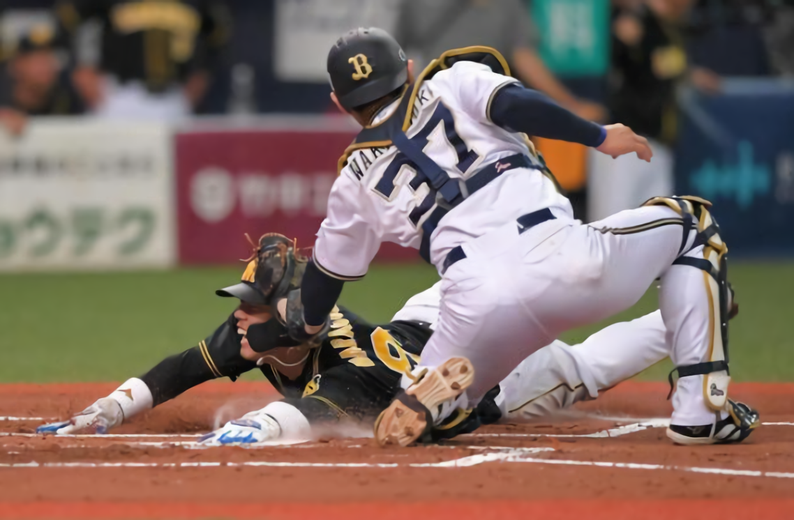 選手会長の一撃に一塁走者・原口が躍動。三塁ベースを蹴り、一気に本塁へ。そのまま勢いよくヘッドスライディングしたが、間一髪のタイミングで判定はアウト。しかし、矢野監督がリクエストを要求した。リプレー検証の結果、判定は覆りセーフ。1点に詰め寄った。