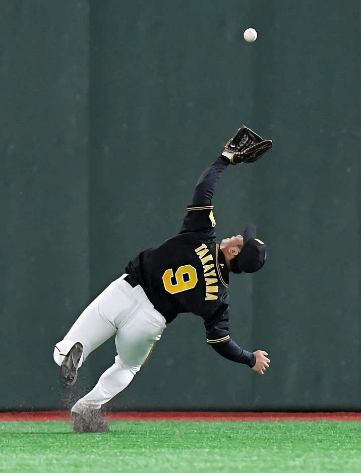 十回、1死一、二塁のピンチで炭谷が放った打球は右越えへの一打。外野手は前進守備を敷いていたが、高山が必死に背走。体を後ろ向きにねじるようにしながらスーパーキャッチした。倒れ込みながらもボールは離さず、サヨナラ負けの大ピンチをしのいだ。
