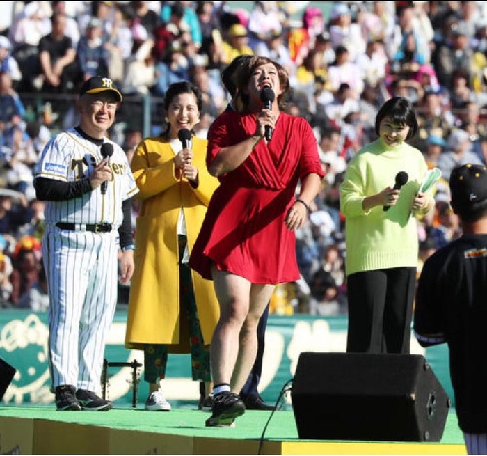 赤いドレスに茶髪ロングのカツラを被って、場内をざわつかせた。これにはベンチ内にいた選手も飛び出し、スマートフォンで撮影。谷川は「もっともっと盛り上がりましょう!」と高い声色で呼びかけた一方、サザンオールスターズの「勝手にシンドバット」を低い地声に戻して歌い上げるなど、りんごちゃんの芸風を再現した。