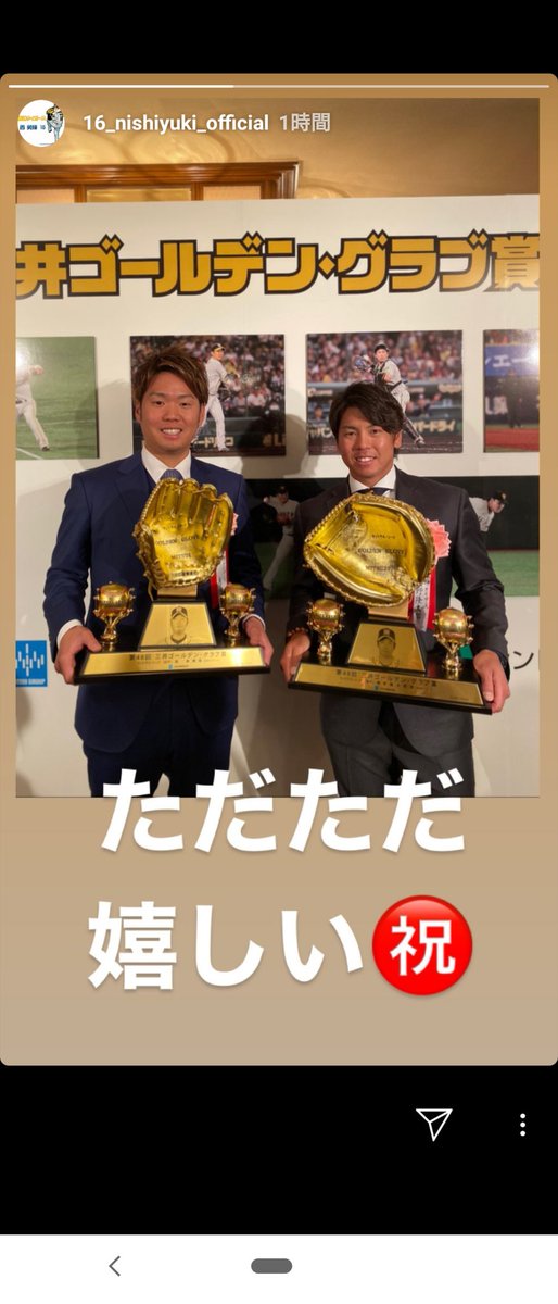 自身のインスタグラムでは梅野との“阪神バッテリー”写真を公開し「ずっと取りたかった」と初のGG賞獲得を喜んだ。