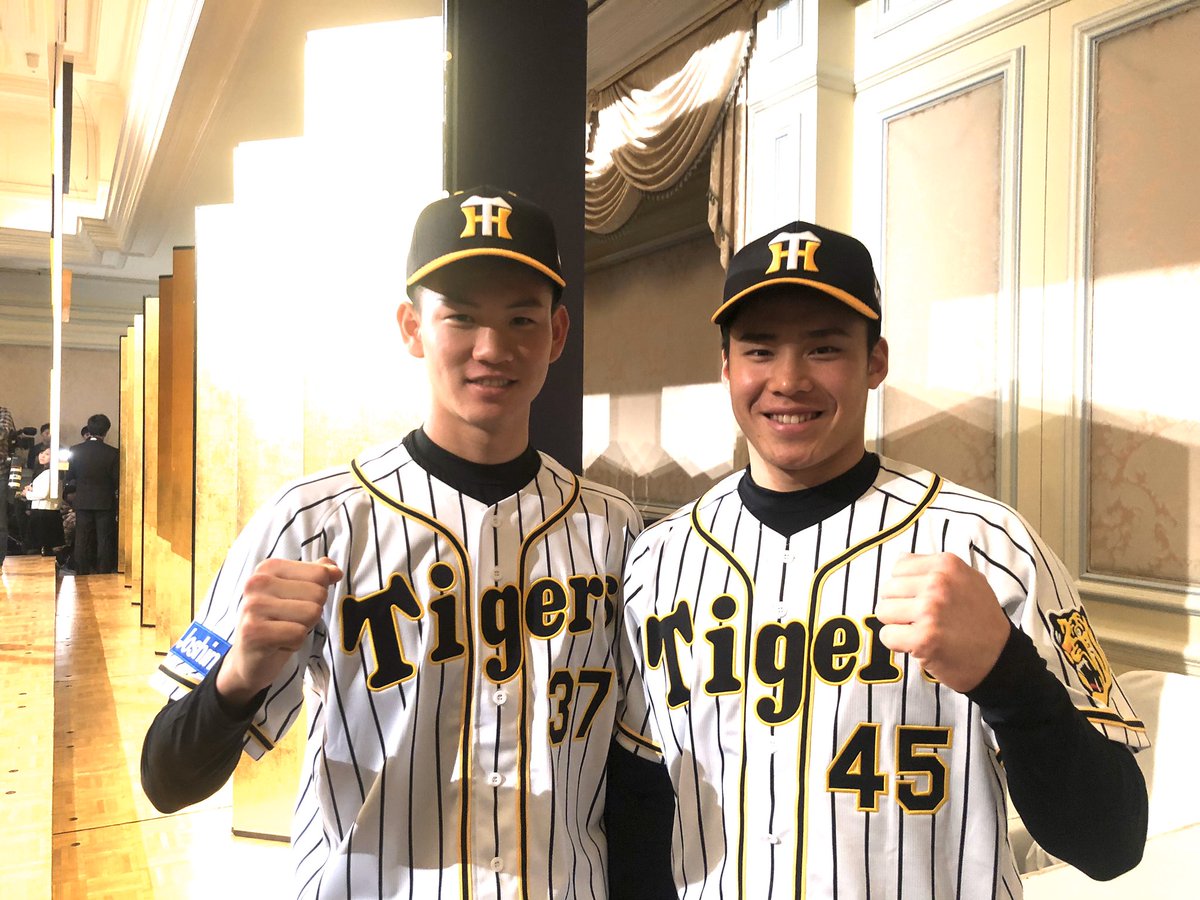 「伝統ある縦じまに袖を通せてうれしく思います。セールスポイントは肩の強さとパンチのある打撃です。目標とする選手は守備では源田選手。打撃ではOBの金本選手のような勝負強いバッティングができるように」