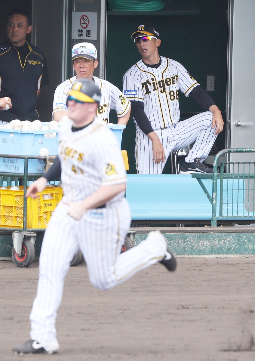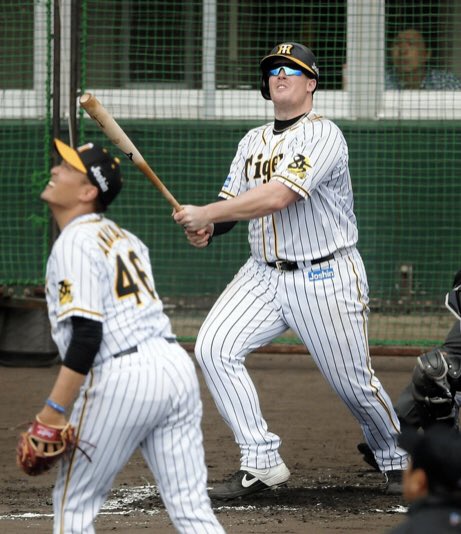 #阪神 #タイガース シート打撃で本塁打を放った #ジャスティン・ボーア 選手と拍手を送る #アンディー・シーツ 駐米スカウトのショットです。#ボーア 選手は守備でも梅野選手の打球を巨体を伸ばして捕球しました! pic.twitter.com/fn8LA3PmRa