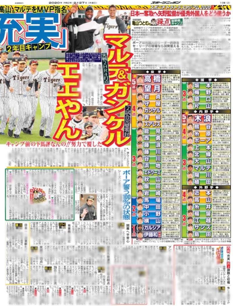 🐯高山選手!矢野&スポニチWでMVP選出で本紙に語った決意🐯矢野監督!打ち上げ100点キャンプ🐯マルテ&ガンケル選手!助っ人の躍動が大収穫🐯恒例!亀山氏の全選手採点🐯コロナ感染対策でオープン戦は無観客 野村氏の追悼試合も延期 pic.twitter.com/7pnWhkqB0o