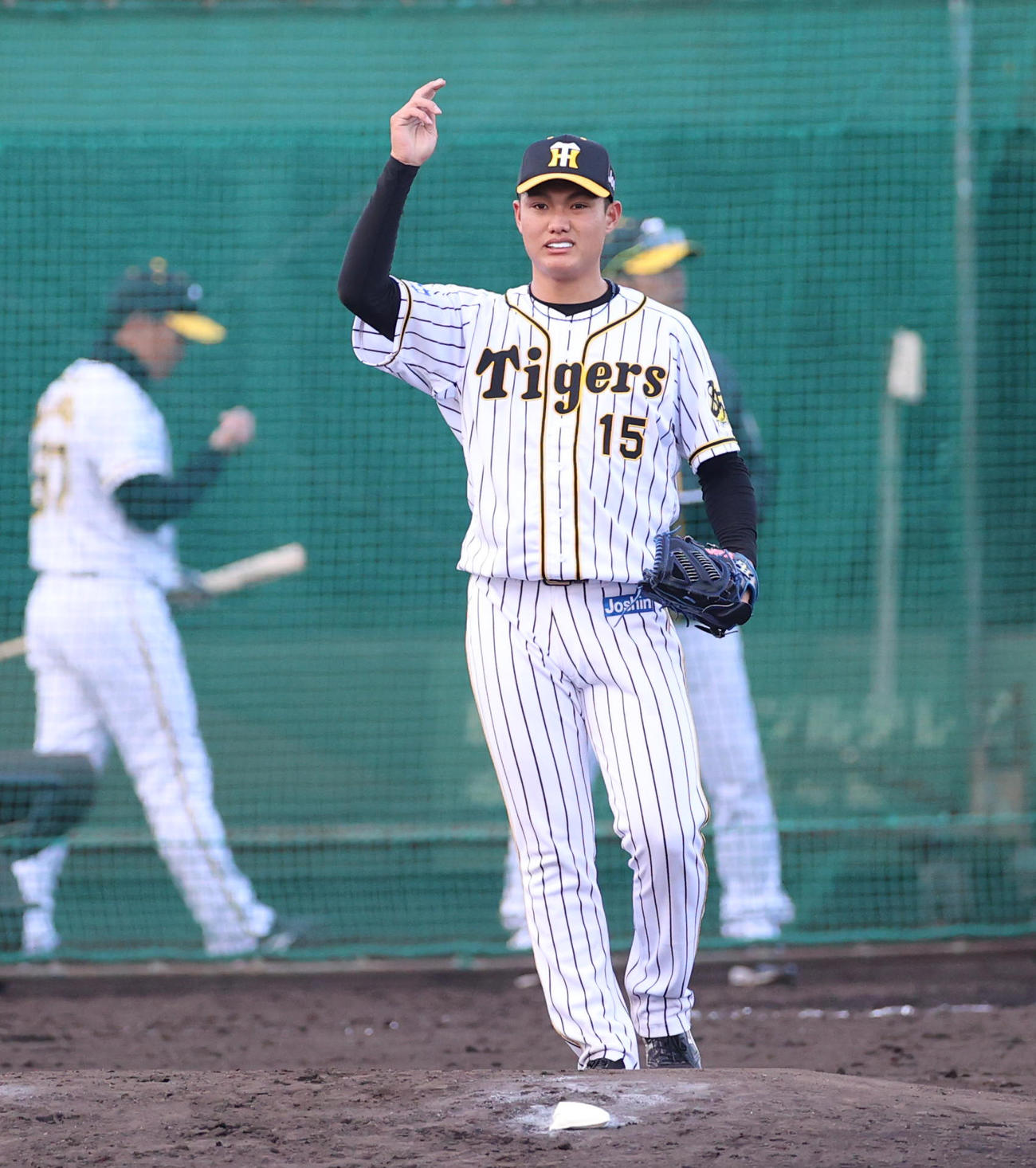 この日は鳴尾浜で、プロ初のシート打撃に登板した。「ボール球とかは多かったけど、ストレートは何球かいい球があって空振りも取れたので、そこは良かった」。小幡と藤谷相手に8打席対戦し、安打性の当たりはゼロ。3四死球を出した制球力を課題に挙げたが、3三振も奪った。チェンジアップ、スライダーなど変化球全てを投げ込みながら直球の最速は141キロ。「50点くらい」と自己評価は厳しめだった。