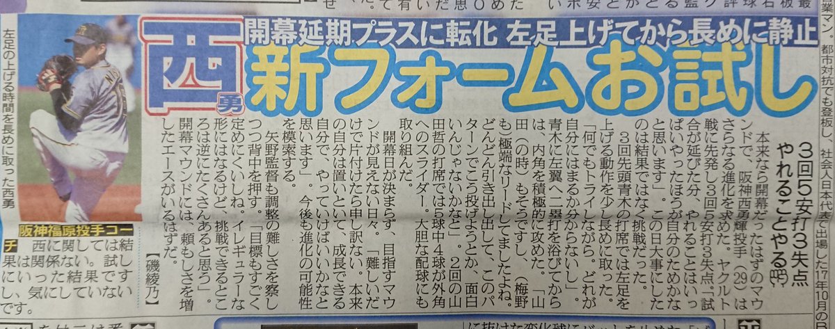 阪神・西勇輝、開幕予定だったヤクルト戦で3回3失点 - SANSPO.COM https://www.sanspo.com/baseball/news/20200320/tig20032015040015-n1.html … @sanspocomさんから