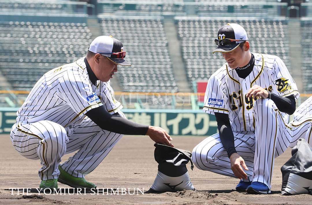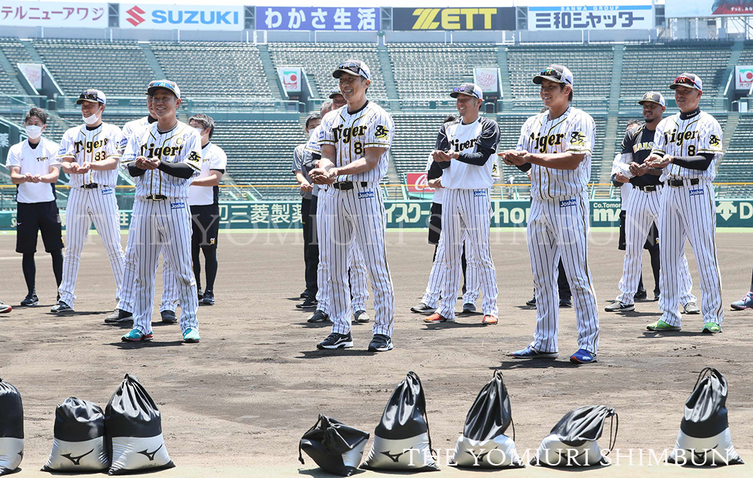 矢野燿大あきひろ監督や福留孝介選手、糸原健斗選手ら約60人がこの日、全体練習を前にファウルグラウンドで土をかき集め、シューズ用の袋に入れた