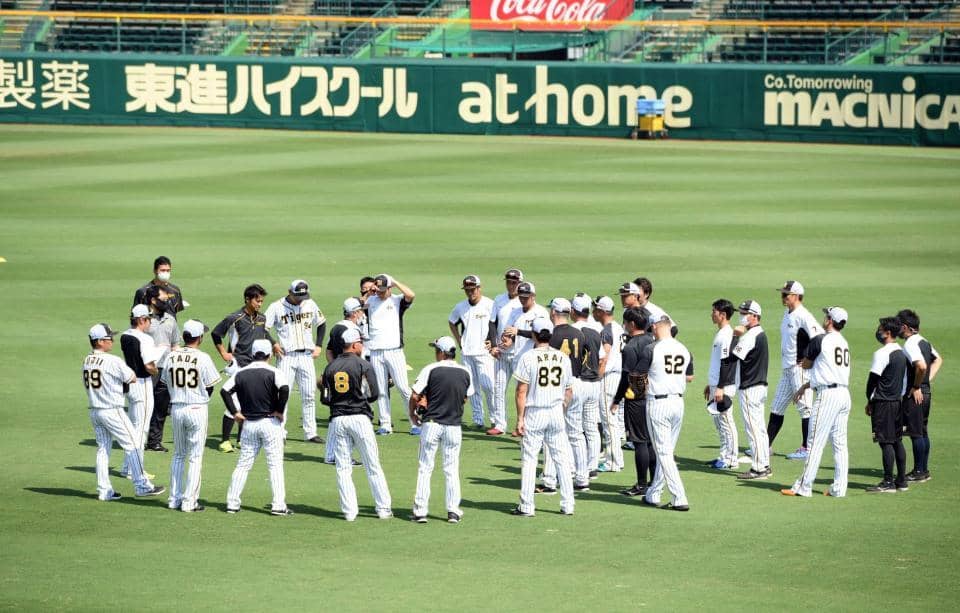 連敗中の阪神が全体練習開始前に、右翼の守備位置付近に円陣を組み、青空の下で緊急ミーティングを開いた。