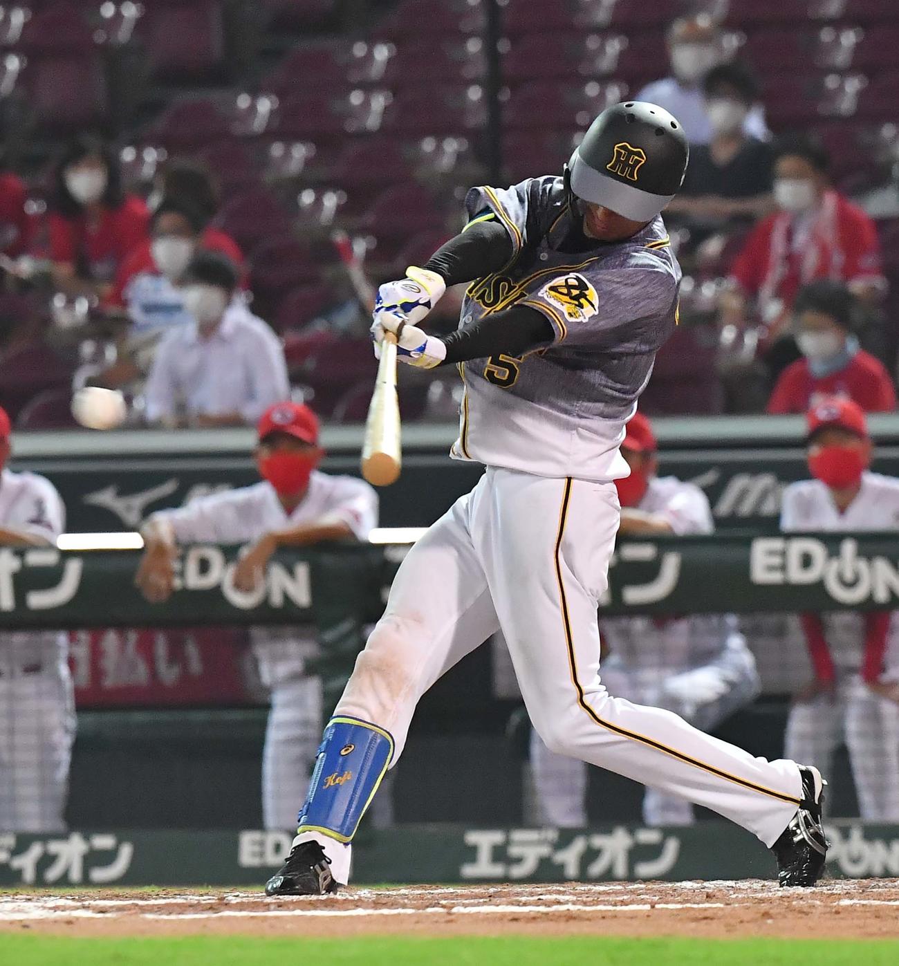 気温の上昇とともに調子を上げてきた。月間打率は6月から徐々に上向き。8月に入ってからは25打数12安打と打ちまくっている。井上打撃コーチは「オレらが放っておいても、いろんなこと考えて練習するタイプ。そういった中で、これだという気づきもあっただろう。こんな感じで打っていた、というのを思い出したのがちょっと見えてきたかな」という。近本自身は好調の要因を、ファーストストライクから打ちにいけている積極性と分析。この日も5打席中3打席でファーストストライクにバットを出した。昨季はリーグ新人最多安打を更新した背番号5。好球必打の姿勢で、本来の姿を取り戻している。
