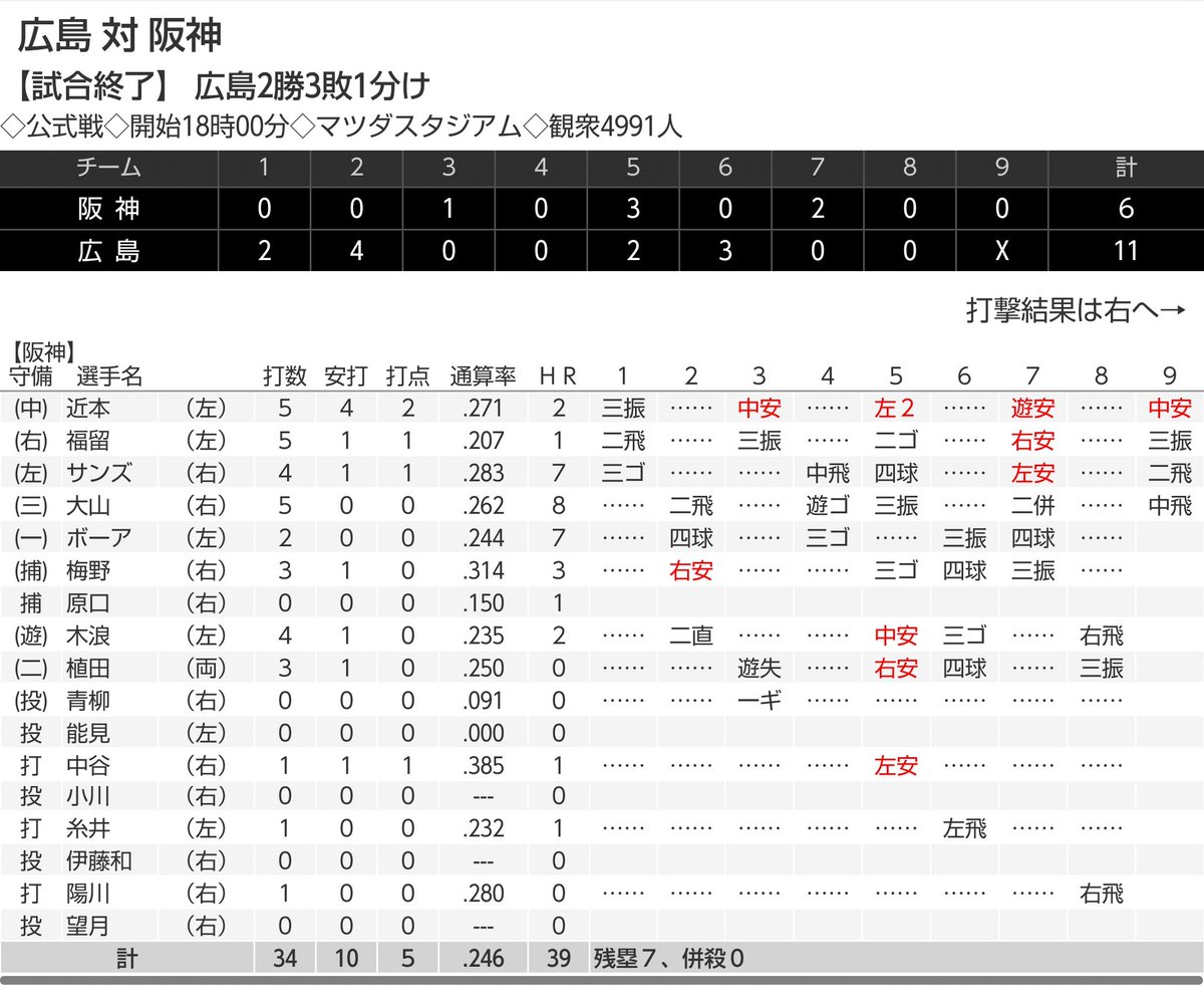 近本くん4安打2打点👍サンズ1安打1四球1打点👍梅ちゃん1安打1四球👍海くん3出塁👍中谷くんタイムリー👍能見さんもっちー無失点👍
