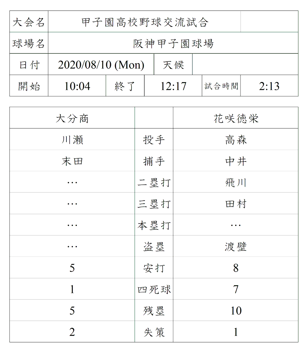 2020年甲子園高校野球交流試合が10日に開幕。その初戦で大分商と花咲徳栄が対戦し、花咲徳栄が3対1で勝利した。