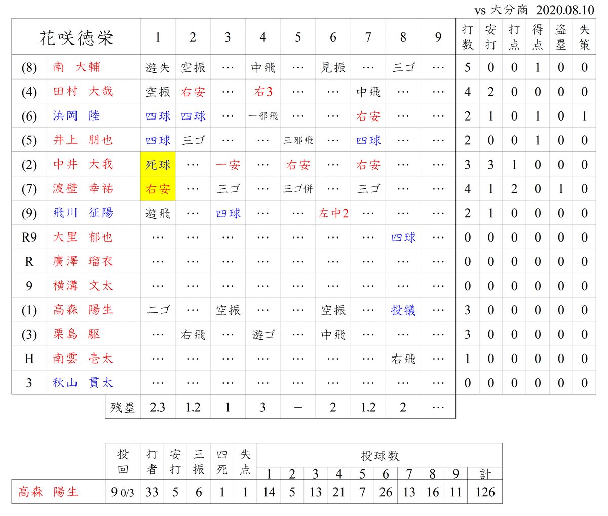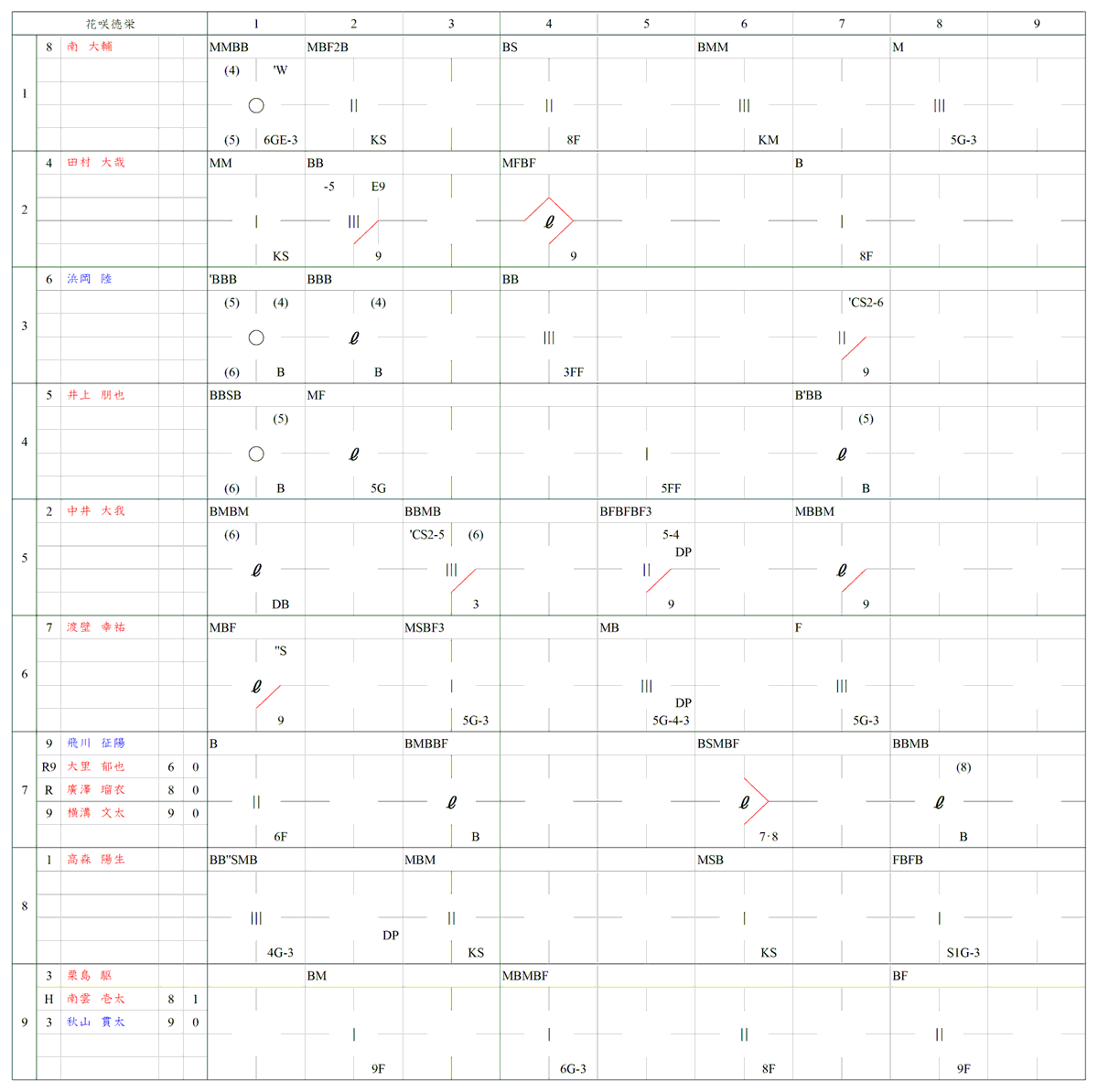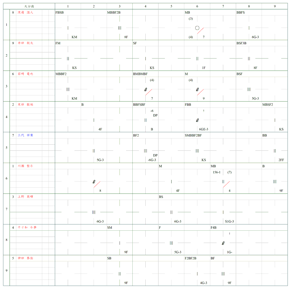 川瀬は2回以降は立ち直り、毎回ランナーを出すも要所は抑えて無失点。大分商打線も6回に1点を返すも、高森の好投の前に決め手を欠いた。8・9回はいずれも三者凡退に抑えられ、奇しくも川瀬が最後の打者となった。熱戦は花咲徳栄が3対1で制した。