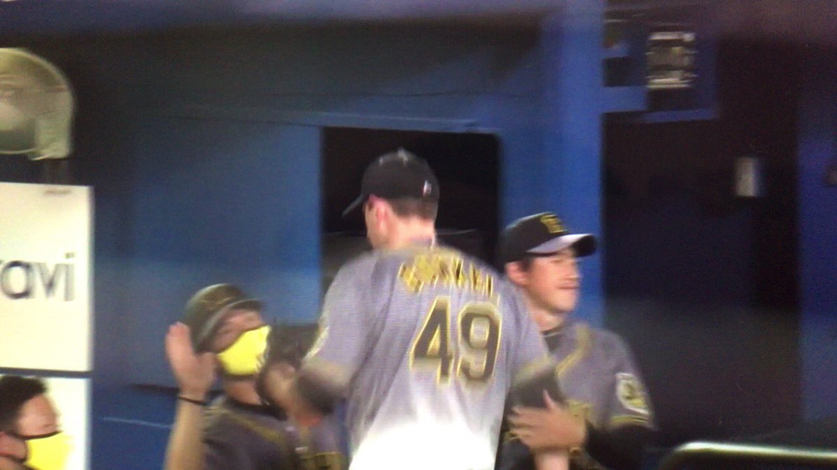 7回の攻撃。リードを2点に広げ、2死満塁。打順は9番に回ってきた。指揮官は代打策ではなく、6回途中からマウンドに上がっていたガンケルをそのまま打席に送り出し、回またぎ登板を選択。試合後、その意図を語った。