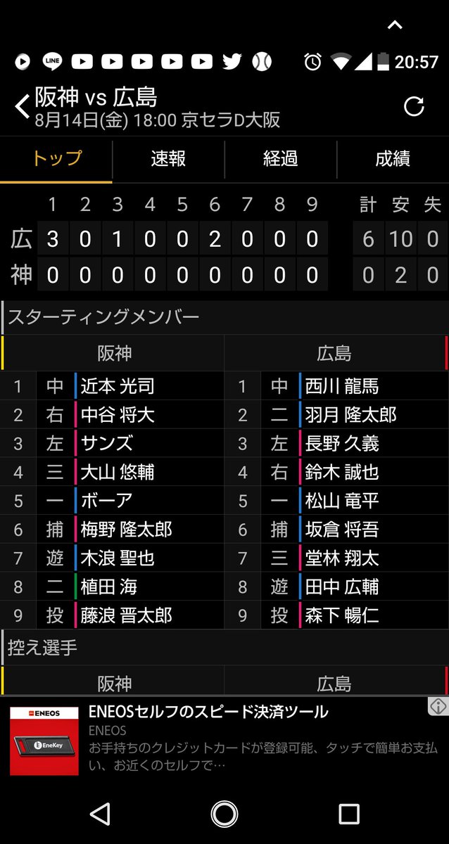 阪神 0-6 広島