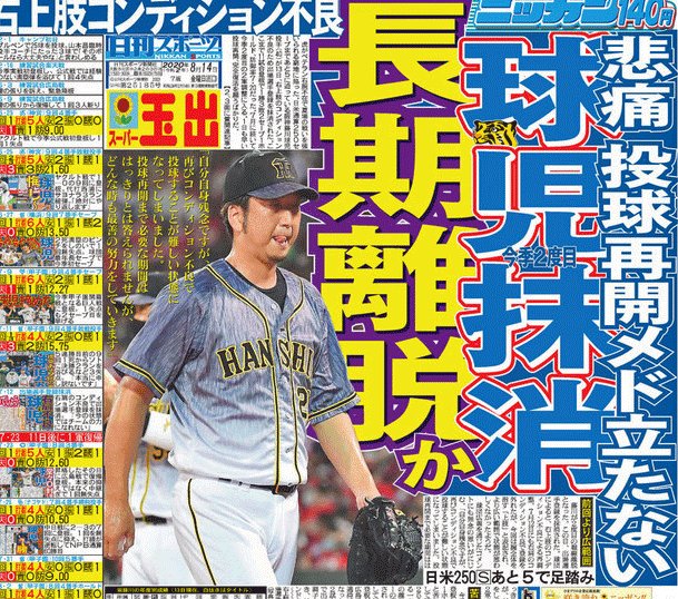 14日の日刊スポーツ大阪版1面。日米通算250セーブまであと5に迫っている阪神藤川球児投手(40)が13日、右上肢のコンディション不良のため出場選手登録を抹消された。ここまで11試合登板で1勝3敗2セーブ1ホールド、防御率7・20。7月に続いて今季2度目の2軍調整に入る pic.twitter.com/fIArw4TGyT