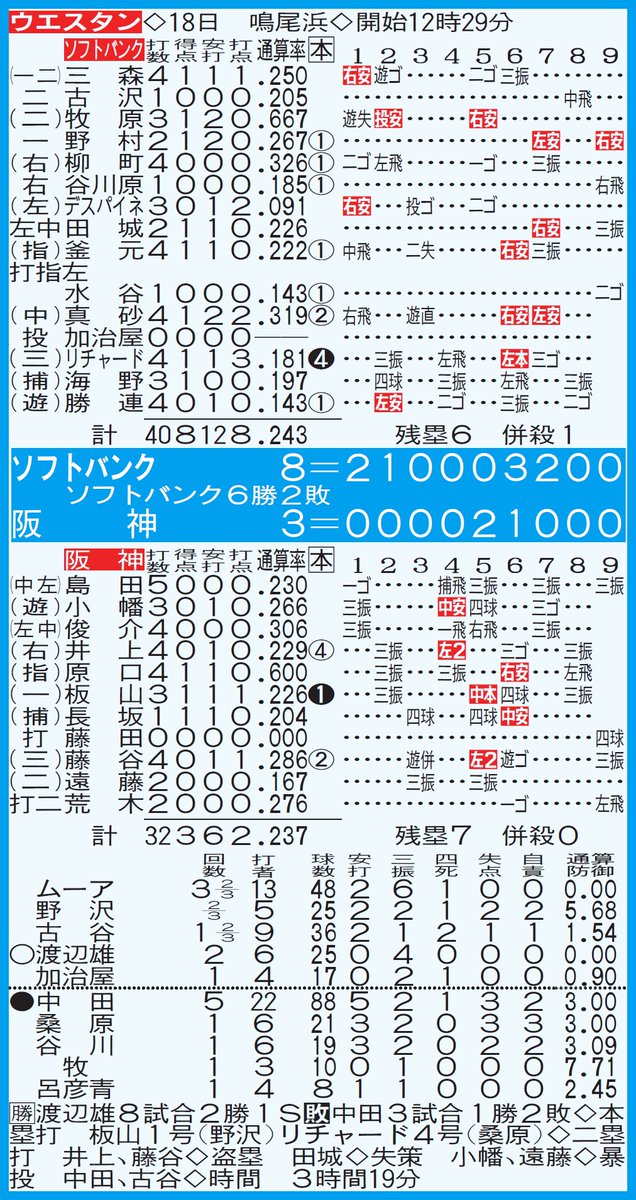 先発の中田賢一(38)は立ち上がりから2点を失い不安定。ただ3回以降は立ち直り、ストライク先行に修正。5回5安打3失点(自責2)と粘った。8試合連続無失点中だった中継ぎの桑原もソフトバンク・リチャードに豪快な3ランを浴びるなど投手陣は8失点。阪神2軍は投打に精彩を欠き、引き分けを挟んで4連敗となった。