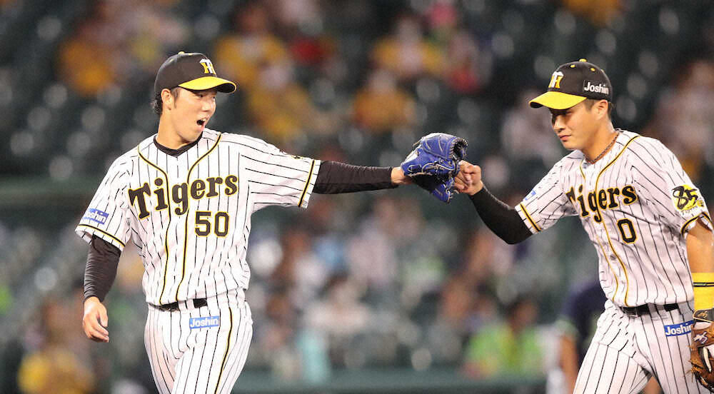 【関本賢太郎 視点】木浪の好判断が、勝利を呼び込みました。同点の6回1死一、三塁。内野の守備陣形は二塁での併殺狙いよりも、やや前でした。打者・塩見が放った打球の弾み方、木浪の捕り方は、おあつらえ向きのバックホーム。私も瞬時に本塁送球を予想しましたが、木浪の判断は違いました。難しい角度にもかかわらず、二塁へジャンピングスロー気味にストライク送球。間一髪のタイミングで見事に併殺を完成させたのです。