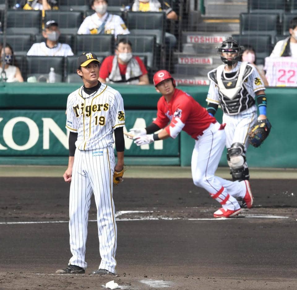 二、三回は無失点でしのいだが、味方が逆転した直後の四回に崩れた。1死からピレラ、曽根の連打で一、三塁。二盗で1死二、三塁から代打長野に四球。ここで矢野監督が交代を告げた。