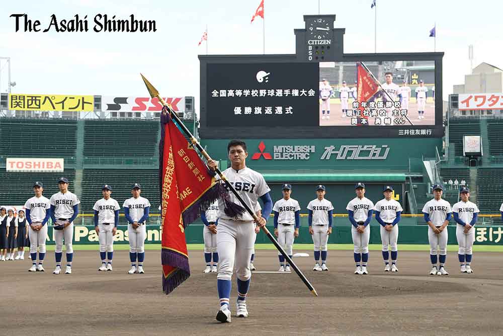 履正社高の野球部員は、西宮市立西宮高の女子生徒の先導で右翼側から入場行進。マウンド付近に整列し、関本勇輔主将が優勝旗を返還した。同主将は「来年は大会が開催されることを願っています」とあいさつした。