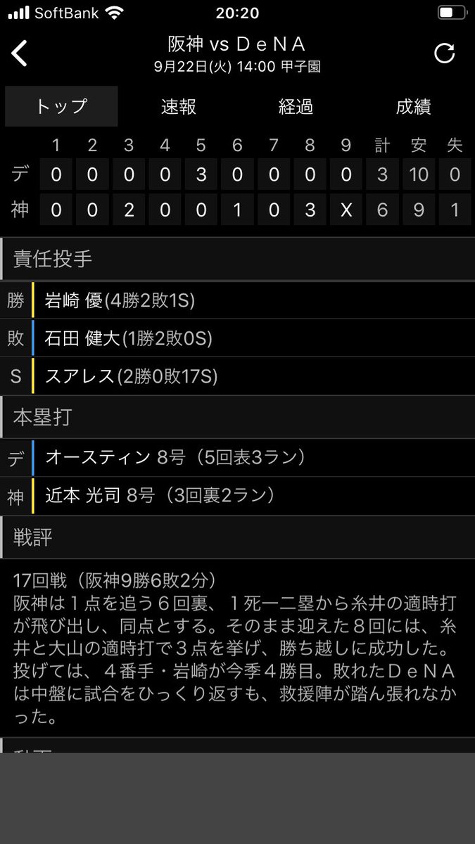 今日も阪神勝ちました‼︎ 昨日に続いて終盤に勝ち越しました‼︎ 勝利投手は2日連続で岩崎優さんでした‼︎ ベイはオースティンさんが3ランと孤軍奮闘しました‼︎ pic.twitter.com/wvqY3mSxi7