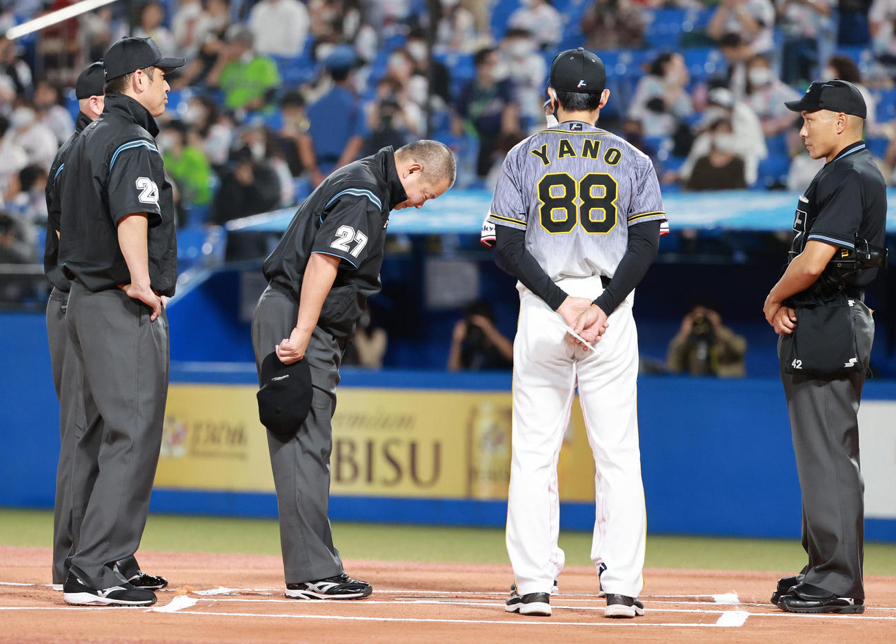 27日の試合開始直前、メンバー交換の際に責任審判の森審判が脱帽して頭を下げた。同日、阪神側と話し合ったセ・リーグ杵渕和秀統括は「(試合が)スムーズに流れなかったというところをお詫びしました。お詫びというのはどちらが良い、悪いとかではなくて、審判のやり取りを通じて試合があれだけ止まった」と明かした。
