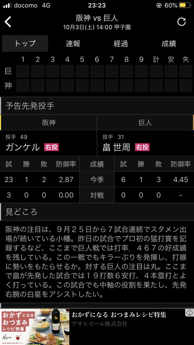 先発転向3試合目のガンケルと今季7試合目の畠。防御率ではガンケルだがWHIP等の指標は畠の方が高い。