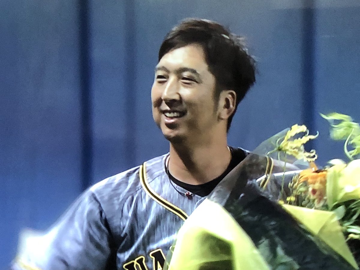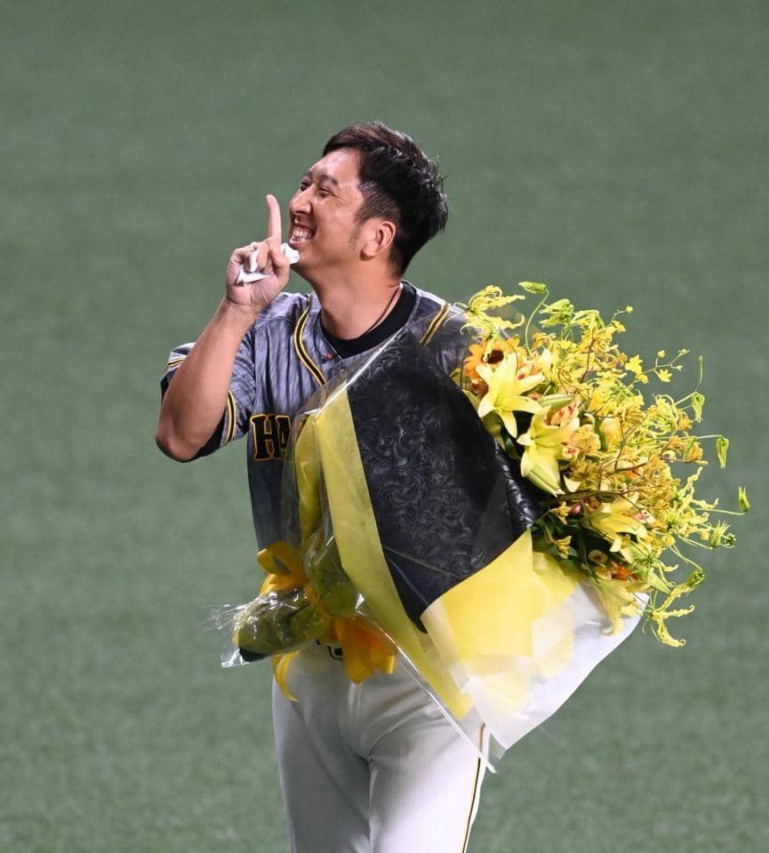サヨナラ勝利の余韻が残る中、ビジョンに「藤川球児投手 22年間お疲れさまでした」と表示され、荒木守備走塁コーチが花束を贈呈。笑顔で言葉を交わすと、そのまま花を持って球場を1周。右翼スタンドからは、異例の「球児コール」が起きた。思わぬ声援に、藤川は人さし指を口に当てて「シーッ」っと笑顔で応対した。