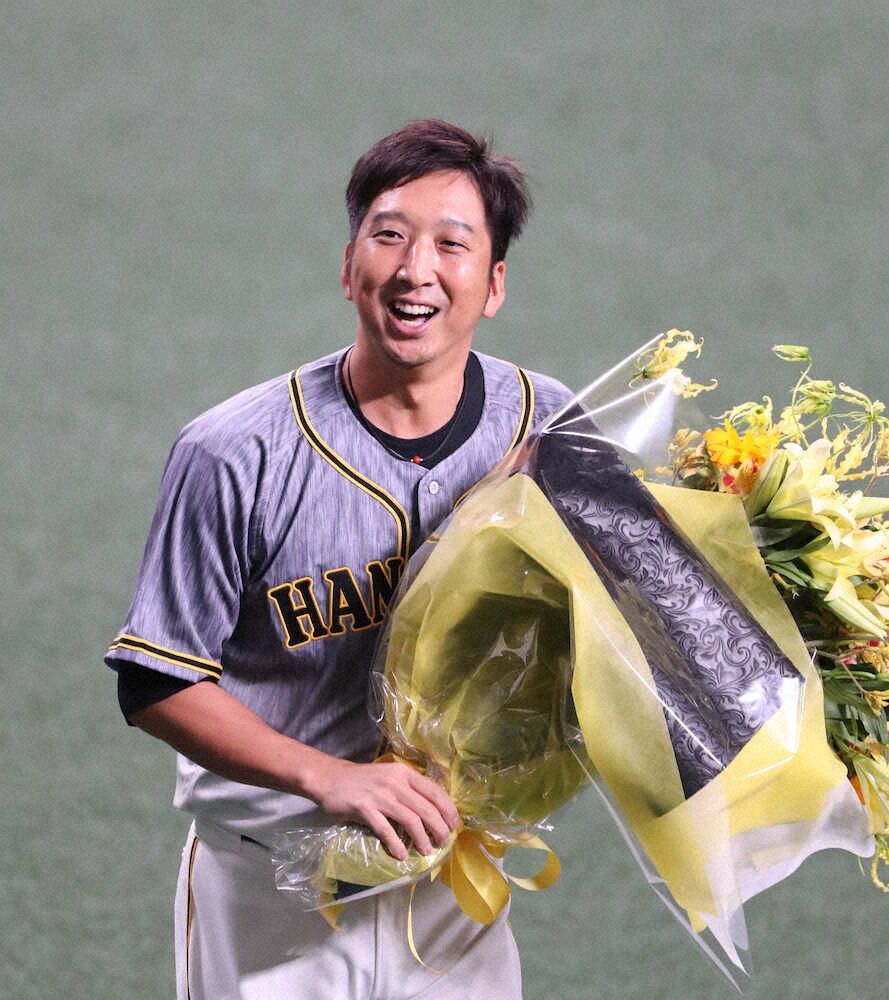 今季限りで現役引退を表明している阪神・藤川球児投手(40)が15日の試合後に中日の荒木雅博内野守備走塁コーチから花束が手渡された。その後、真っ先に敵陣の右翼スタンドに向かうと、竜党から引退を惜しむ大きな拍手で送られた。そのまま左翼スタンドにも移動し、名古屋の虎党に何度も頭を下げて惜別した。
