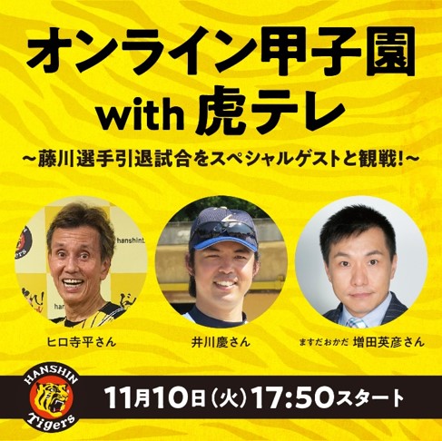 11月10日(火)に阪神甲子園球場で行われる試合にて、Web会議システムZoomを使用した『「オンライン甲子園 with 虎テレ」~藤川選手引退試合をスペシャルゲストと観戦!~』を開催いたします。