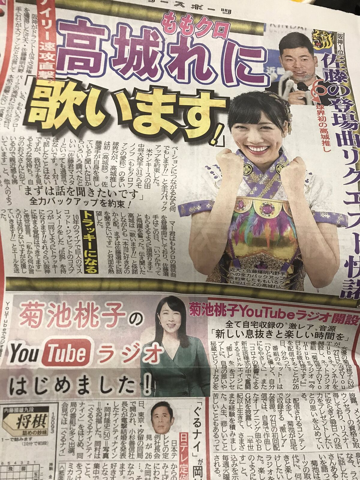 阪神がドラフト1位で交渉権を獲得した近大・佐藤輝明内野手(21)が大ファンだと公言している、ももいろクローバーZの高城れに(27)が26日、デイリースポーツの直撃に応じ「成績やモチベーションにつながるなら何でもします!!」と全力バックアップを約束した。