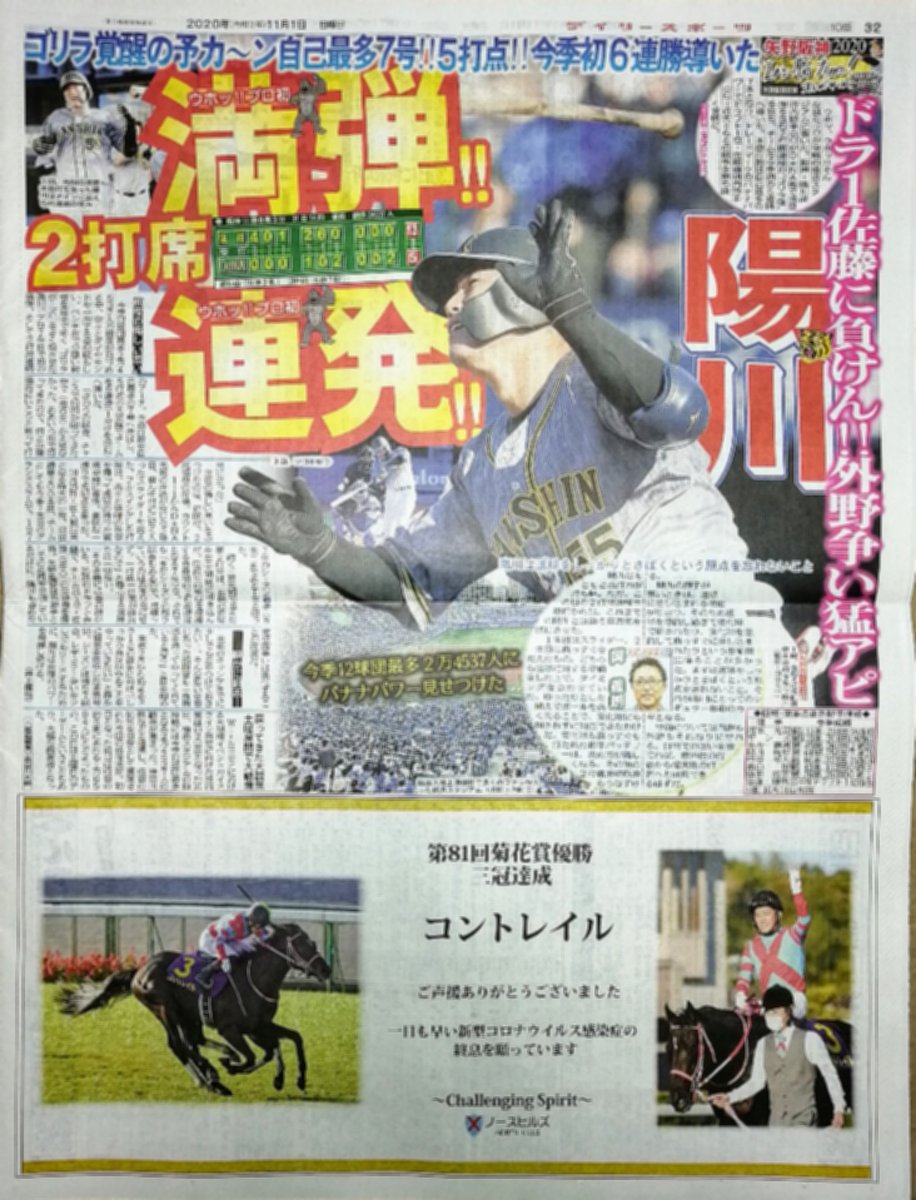1面は天皇賞(秋)でした、裏1面は昨日大暴れの🦍陽川選手です🍌